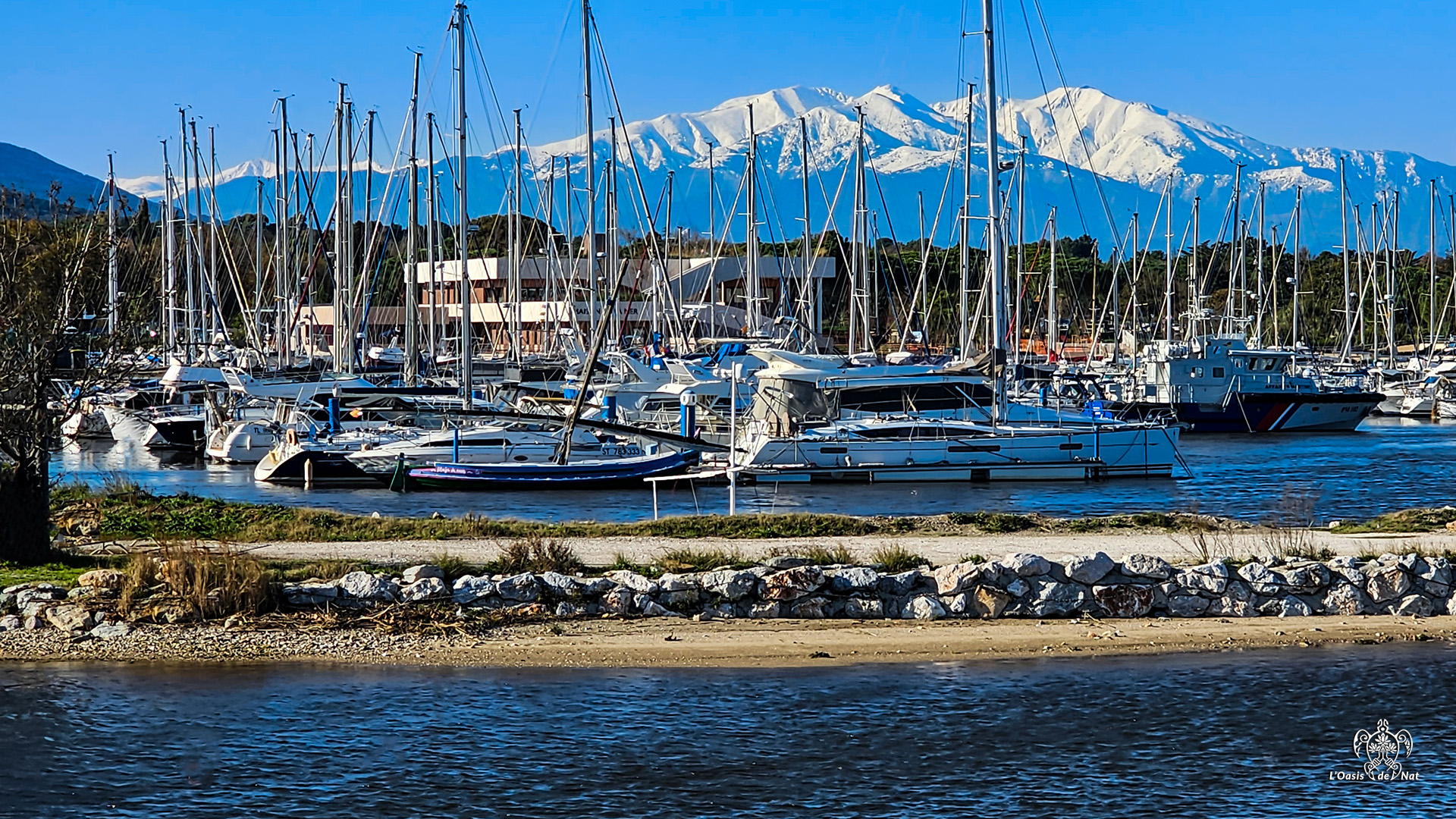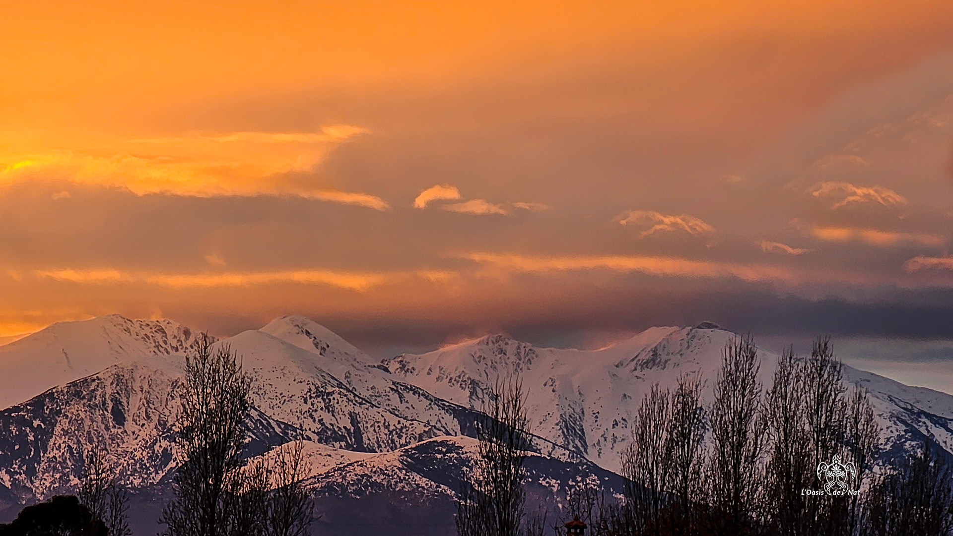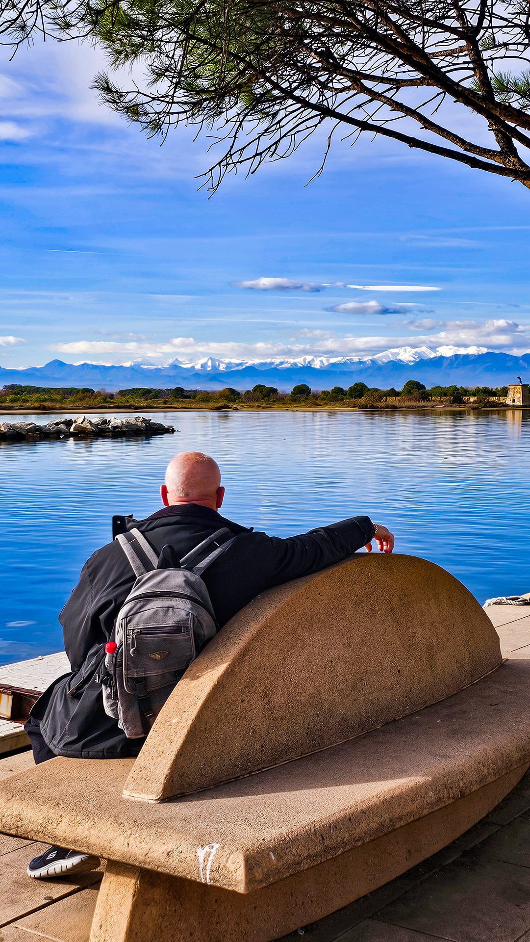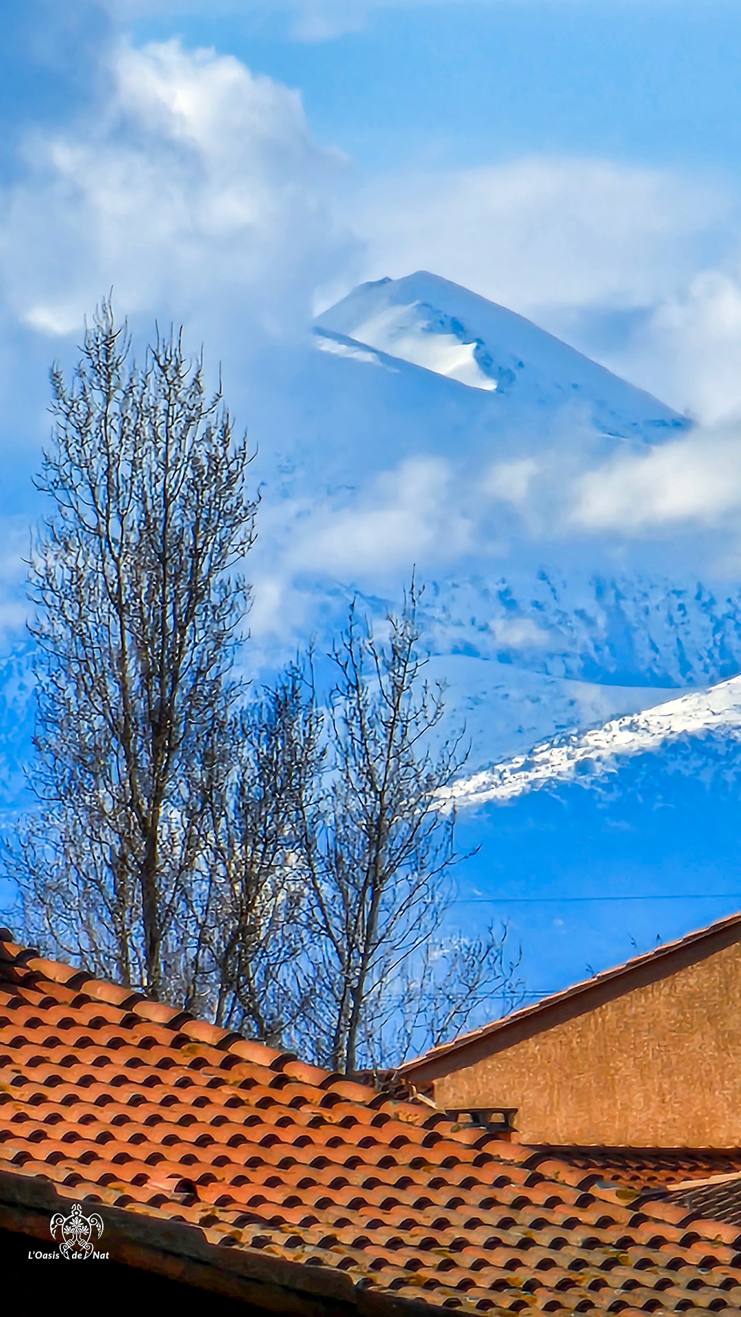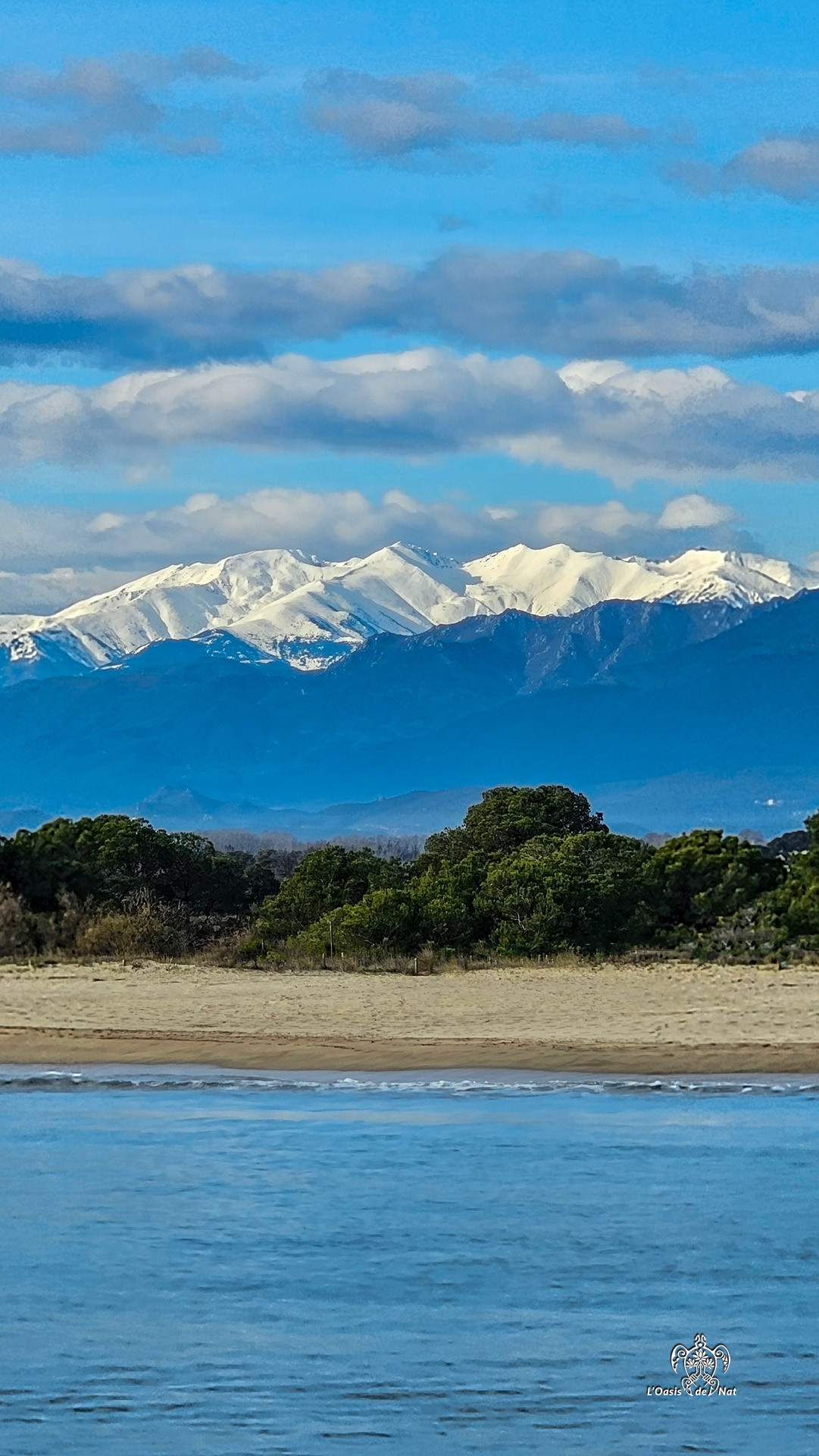 Ce contraste me plaît — ici l’hiver est bien là, les sommets enneigés nous le rappellent.